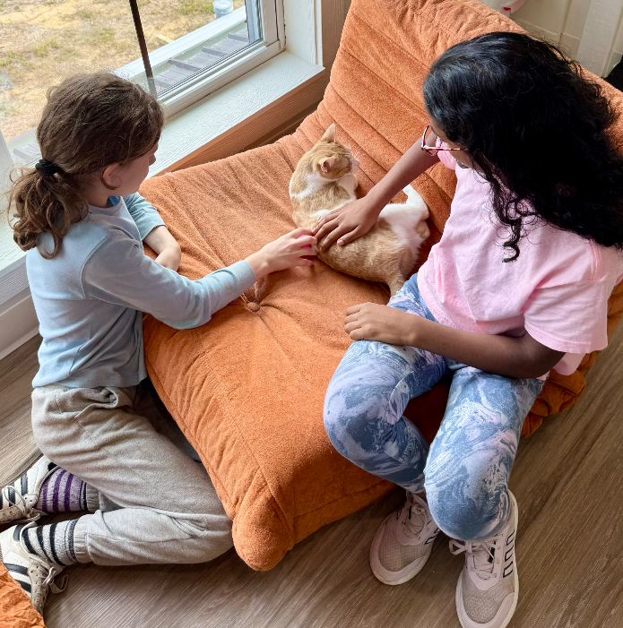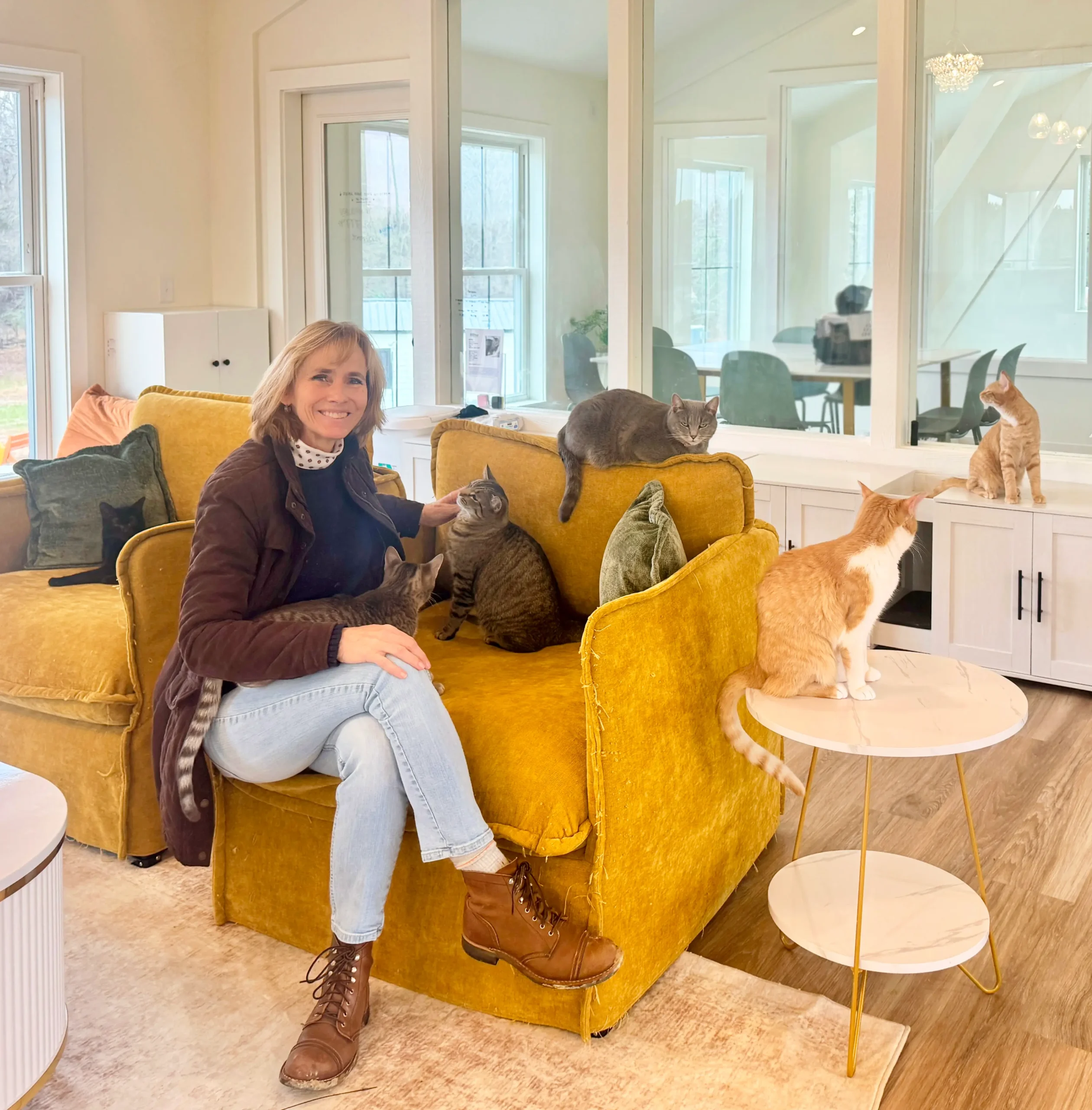 Our Beautiful Together Cat Cafe is a bright, welcoming space where rescued cats can relax, heal, and meet the people who may become their forever families. With floor-to-ceiling windows overlooking our pastures, the cats spend their days basking in sunlight, watching birds swoop by, and enjoying a peaceful view of the sanctuary they call home – for now.