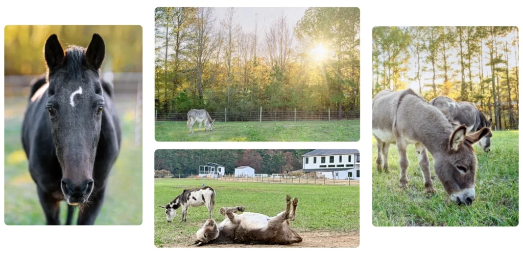 Our horse and donkey rescue began with a deeply bonded equine family: one horse, one donkey, and five miniature donkeys who had already been rescued and lovingly kept together. Their caregivers were seeking true sanctuary for them – a place where they could remain safe, supported, and together for the rest of their lives. Welcoming this special herd became the foundation of our equine program, and they now live peacefully in our pastures, receiving thoughtful care and the space to simply be.