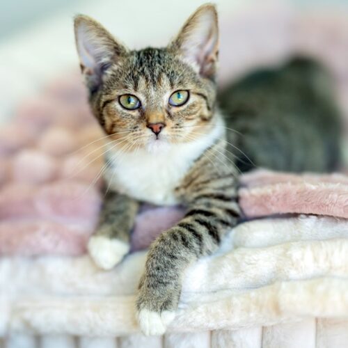 Get ready to be charmed by Dahlia, a kitten as beautiful and sweet as her name suggests! This little gem is absolutely brimming with gentleness and affection. Dahlia loves to dive into playtime, whether she's batting around her favorite toys or zipping through the house in an exciting chase with her siblings.