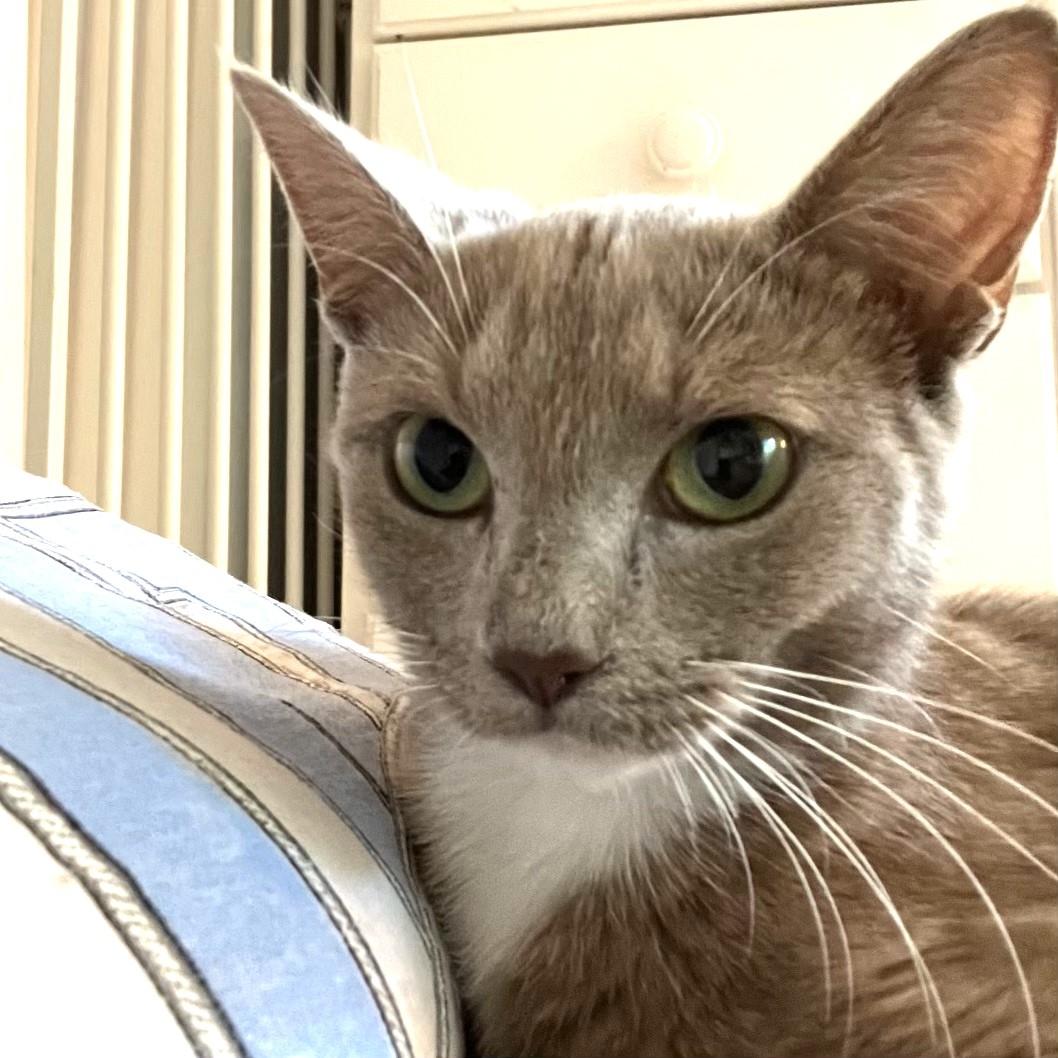 Not quite brown, but not quite gray, with beautifully symmetrical white lines defining her tuxedo pattern, Delaney is a very special lavender color! Delaney is affectionate and playful, but she will need a patient family that can help her adapt to a luxurious new lifestyle that does not involve a shelter cage. This little girl is a little timid at first, but then gets so excited to see you that she can't decide whether to play or snuggle, so she ends up doing both at once. Delaney is also very vocal, with sounds that range from tiny squeaks to louder yells (she's still learning to control her volume). Everything about this girl is truly unique. She is an absolute delight to play with, and loves to chase toys of all kinds. She loves being petted and is trying to figure out lap snuggles. She seems to like other cats, but will need a gentle playmate, and she would do really well with a friendly cat that can show her the ropes. This dainty little girl is just looking for someone to love her and play with her, preferably at the same time.