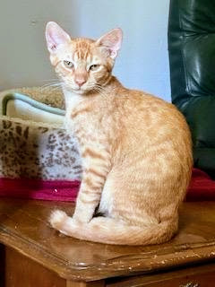 Mel loves to be pet but does not like to be picked up (as of yet). He will come and sit in you lap, so he likes affection on his terms. He has atypical orange fur: it is sleek and soft.