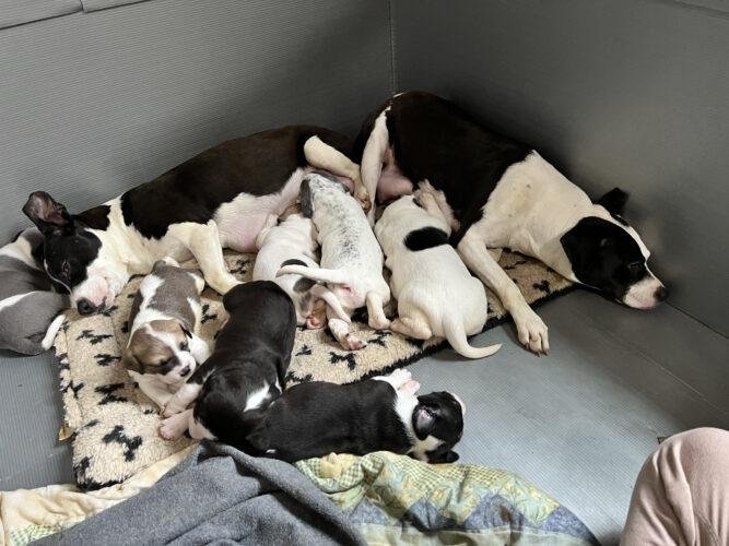 One night, Hallie looked like she was beginning to go into labor, so Jane sat with her all night. Mere minutes after Hallie’s first puppy emerged, Annie gave birth, too! After a long night, Annie gave birth to two large puppies, and Hallie gave birth to nine, although sadly, some of them did not survive due to birth defects.